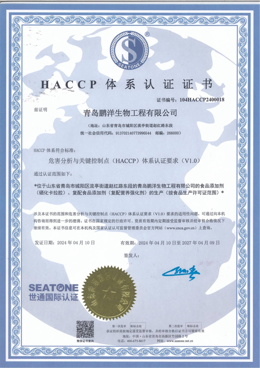 青島鵬洋生物工程有限公司是一家專門從事海洋生物活性物質和新資源食品原料研發、生產、銷售的高新技術企業。公司依托科研院所、高校,以及自身強大的研發實力不斷創新,獲得多項國家發明專利和榮譽,是食品安全國家標準《食品安全國家標準 食品營養強化劑 硒化卡拉膠》(GB 1903.23-2016)的起草單位、中國食品添加劑和配料協會會員單位...詳情